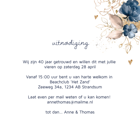 Uitnodiging 40 jarig huwelijk maken. Je past ze zelf eenvoudig aan naar eigen smaak. Wat past bij jullie. Het bereiken van zon mijlpaal is natuurlijk een feestje waard.