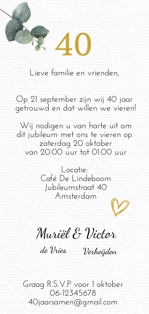 Stijlvol Jubileumkaartje 40 Jarig Huwelijk Met Eucalyptus Tak En Foto