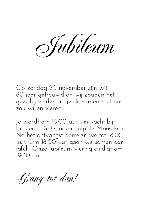 60 jaar getrouwd jubileum. 96 10000 reviews Vragen. Omdat we nog steeds heel blij zijn met elkaar willen we dit graag met jullie vieren op DAG DATUM. Vriendschap vreugde warm en teder.