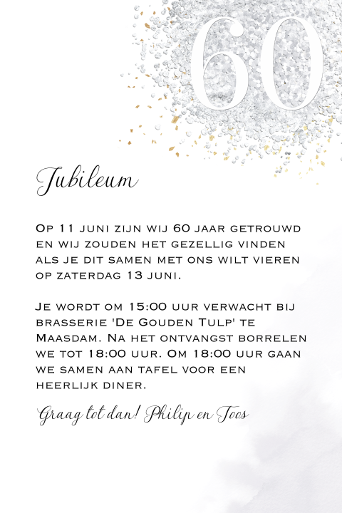Ontvang een uitgebreid proefdrukpakket Klantenbeoordeling. Vaak kiest men over de teksten op hun 60 jaar getrouwd uitnodiging in folie te drukken. Kies je design en maak je unieke kaart.
