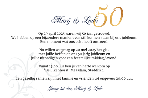 Teksten kaarten 50 jarig huwelijksjubileum. Verzendkosten 250. Een trouwdag huwelijksverjaardag of huwelijksjubileum is een moment waarop mensen de dag vieren dat zij een bepaald aantal jaren zijn getrouwd.